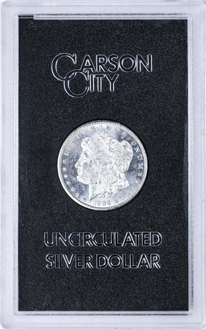 One 1884-CC $1 Morgan Silver Dollar Coin GSA Hoard Uncirculated w/Box & COA.