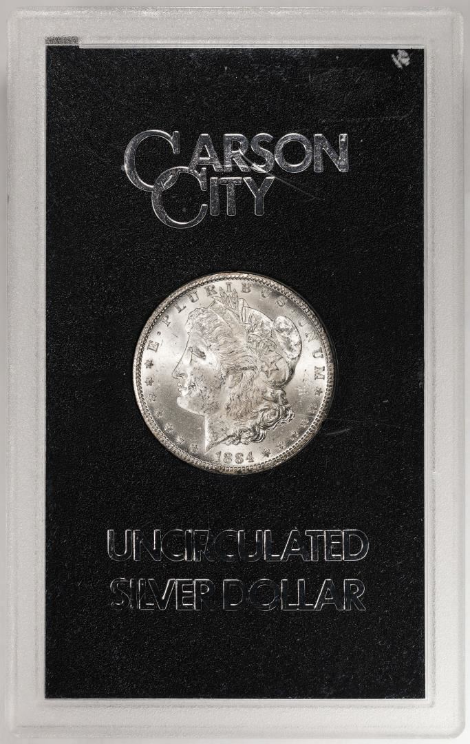 One 1884-CC $1 Morgan Silver Dollar Coin GSA Hoard Uncirculated w/Box & COA.