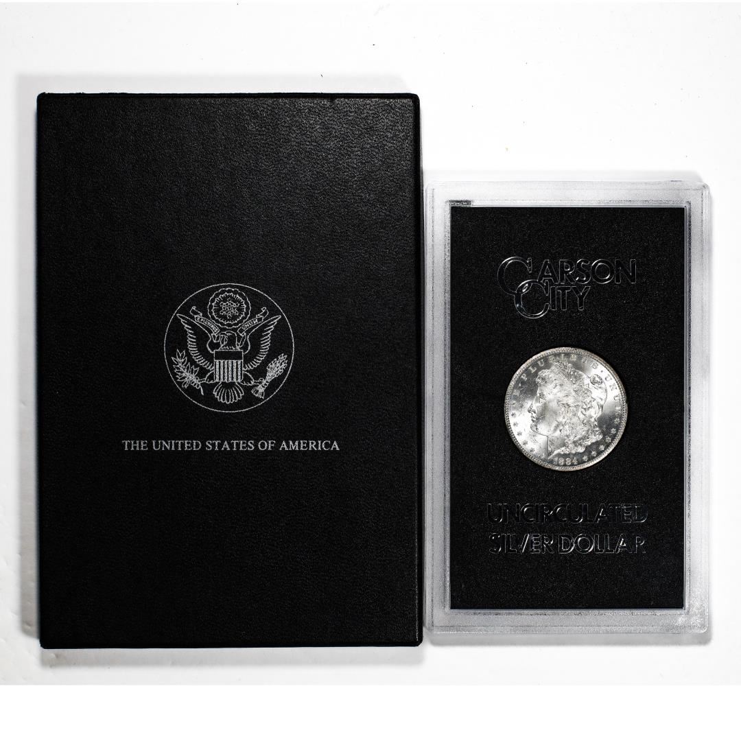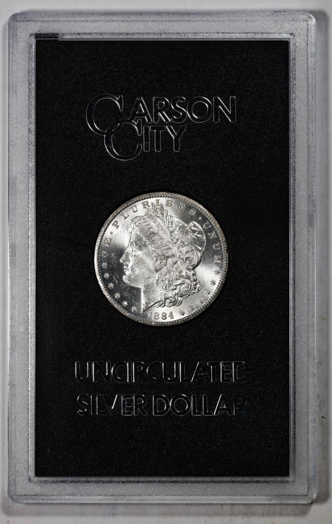One 1884-CC $1 Morgan Silver Dollar Coin GSA Hoard Uncirculated w/Box.