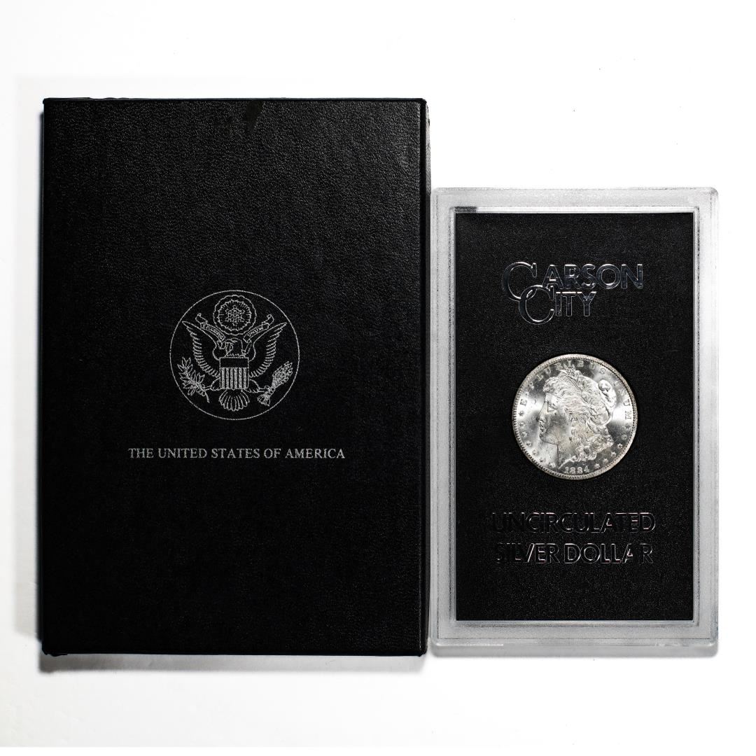 One 1884-CC $1 Morgan Silver Dollar Coin GSA Hoard Uncirculated w/Box.