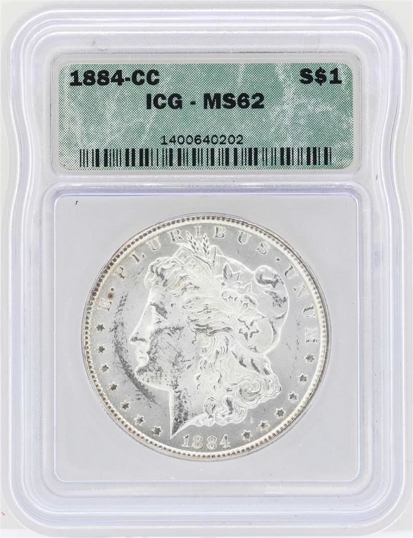 One 1884-CC $1 Morgan Silver Dollar Coin ICG MS62. ICG Certified.