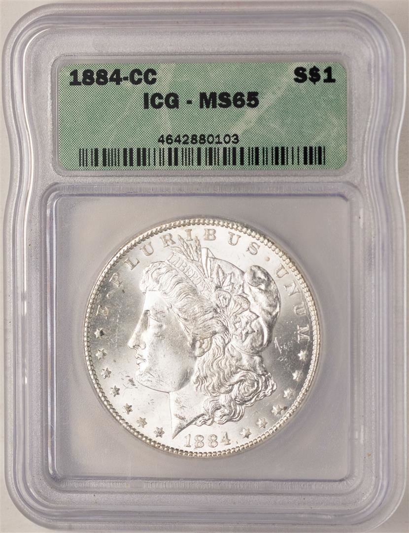 One 1884-CC $1 Morgan Silver Dollar Coin ICG MS65. ICG Certified.