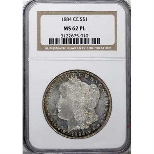 <B>1884-CC $1 MS62 Prooflike NGC.</B></I> . NGC Census: (105/1224). PCGS Population (235/2354). Numismedia Wsl. Price for NGC/PCGS coin in MS62: $192. (#7153)<BR><BR><B>Coin Engraver:</B> George T. Morgan<BR><BR><b>Shipping:</b> Coins & Currency (<a target="_blank" href="http://www.heritageauctions.com/common/shipping.php">view shipping information</a>)