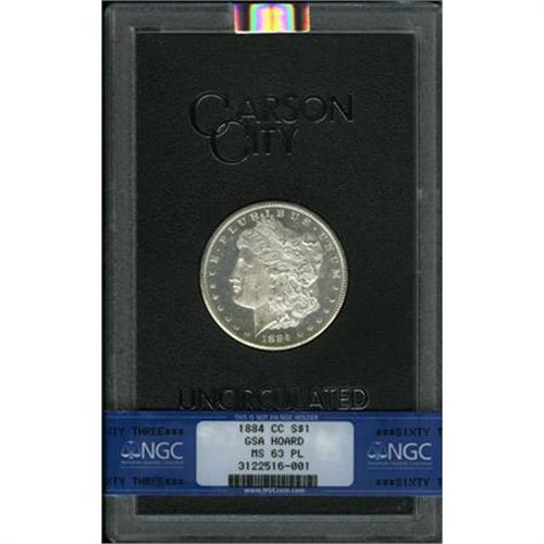 <B>1884-CC $1 MS63 Prooflike NGC.</B></I> The Box and Certificate of Issue are included.<BR>NGC Census: (343/869). PCGS Population (771/1577). Numismedia Wsl. Price for NGC/PCGS coin in MS63: $208. (#7153)<BR><BR><B>Coin Engraver:</B> George T. Morgan<BR><BR><b>Shipping:</b> Coins & Currency (<a target="_blank" href="http://www.heritageauctions.com/common/shipping.php">view shipping information</a>)