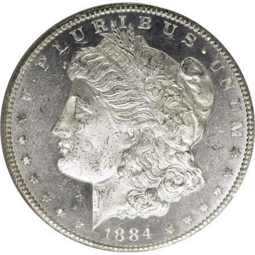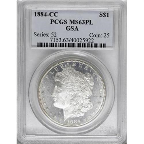 <B>1884-CC $1 MS63 Prooflike PCGS.</B></I> Ex: GSA. PCGS Population (771/1577). NGC Census: (343/874). Numismedia Wsl. Price for NGC/PCGS coin in MS63: $208. (#7153)<BR><BR><B>Coin Engraver:</B> George T. Morgan<BR><BR><b>Shipping:</b> Coins & Currency (<a target="_blank" href="http://www.heritageauctions.com/common/shipping.php">view shipping information</a>)