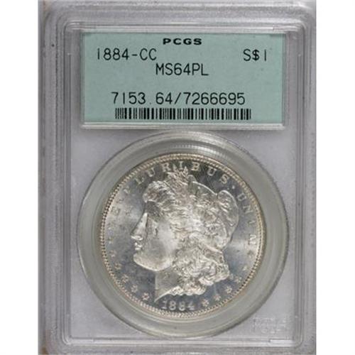 <B>1884-CC $1 MS64 Prooflike PCGS.</B></I> PCGS Population (1064/507). NGC Census: (592/261). Numismedia Wsl. Price for NGC/PCGS coin in MS64: $240. (#7153)<BR><BR><B>Coin Engraver:</B> George T. Morgan<BR><BR><b>Shipping:</b> Coins & Currency (<a target="_blank" href="http://www.heritageauctions.com/common/shipping.php">view shipping information</a>)