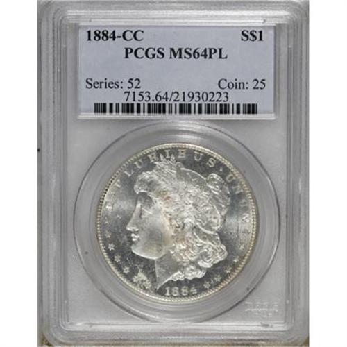 <B>1884-CC $1 MS64 Prooflike PCGS.</B></I> PCGS Population (1074/514). NGC Census: (613/273). Numismedia Wsl. Price for NGC/PCGS coin in MS64: $240. (#7153)<BR><BR><B>Coin Engraver:</B> George T. Morgan<BR><BR><b>Shipping:</b> Coins & Currency (<a target="_blank" href="http://www.heritageauctions.com/common/shipping.php">view shipping information</a>)