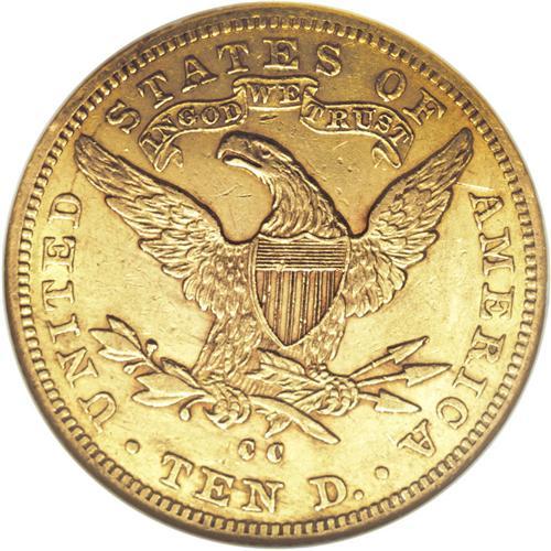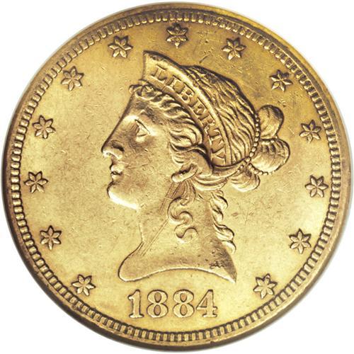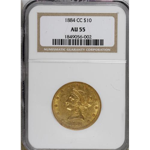 <B>1884-CC $10 AU55 NGC.</B></I> The luminous yellow-orange surfaces of this Choice AU eagle retain a touch of frosty luster in the fields. Only a handful of small marks affect each side, a surprise for this heavily circulated issue of under 10,000 pieces. A modestly worn representative of this mid-date issue, one best known for the "chisel mark" die diagnostics evident on Liberty's neck.<BR><BR><b>Shipping:</b> Coins & Currency (<a target="_blank" href="http://www.heritageauctions.com/common/shipping.php">view shipping information</a>)