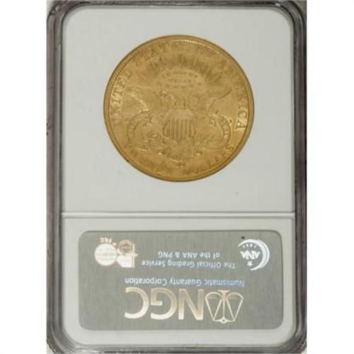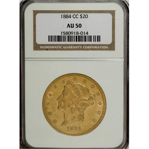 <B>1884-CC $20 AU50 NGC.</B></I> A shimmering About Uncirculated representative that retains ample luster. The lightly marked surfaces are predominantly yellow-gold with subtle carrot-orange accents. The 1884-CC is a popular issue with collectors for its high overall quality and its availability compared to other issues of the 1880s.<BR><BR><B>Coin Engraver:</B> James B. Longacre<BR><BR><b>Shipping:</b> Coins & Currency (<a target="_blank" href="http://www.heritageauctions.com/common/shipping.php">view shipping information</a>\)