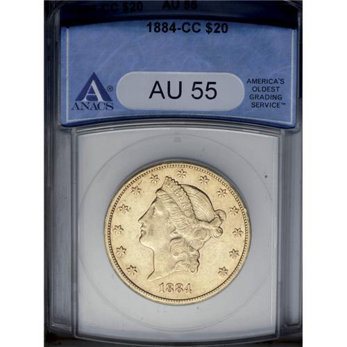 <B>1884-CC<$20> AU55 ANACS.</B></I> A lightly worn and solidly struck piece that retains most of its original luster. An attractive and minimally marked Carson City product.