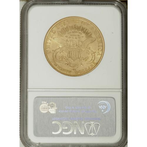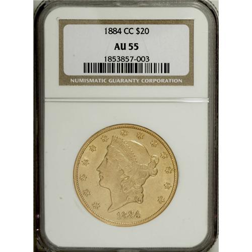 <B>1884-CC $20 AU55 NGC.</B></I> This Choice AU Carson City double eagle has softly lustrous apricot-gold surfaces tinged with apple-green. The minor abrasions present on the portrait are few and not distracting, taken as a whole. Overall, a worthy example of this popular issue.<BR><BR><b>Shipping:</b> Coin/Currency (<a target="_blank" href="http://www.heritageauctions.com/common/shipping.php">view shipping information</a>)