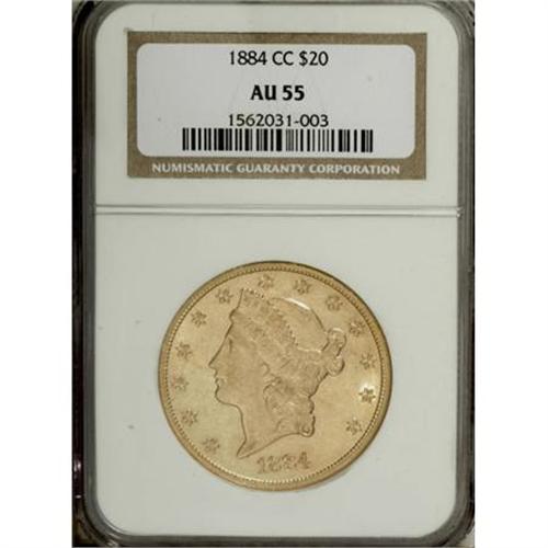 <B>1884-CC $20 AU55 NGC.</B></I> NGC Census: (215/593). PCGS Population (115/264). Mintage: 81,139. Numismedia Wsl. Price for NGC/PCGS coin in AU55: $1,875. (#9001)<BR><BR><B>Coin Engraver:</B> James B. Longacre<BR><BR><b>Shipping:</b> Coins & Currency (<a target="_blank" href="http://www.heritageauctions.com/common/shipping.php">view shipping information</a>\)