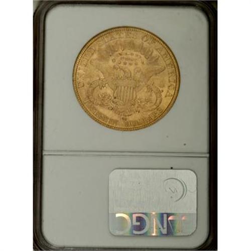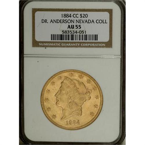 <B>1884-CC $20 AU55 NGC.</B></I> Ex: Dr. Anderson Nevada Collection. This olive-gold Carson City twenty offers substantial luster and is evenly struck. Attractive for the grade despite moderate contact near the cheekbone.<BR><BR><B>Coin Engraver:</B> James B. Longacre<BR><BR><b>Shipping:</b> Coins & Currency (<a target="_blank" href="http://www.heritageauctions.com/common/shipping.php">view shipping information</a>)