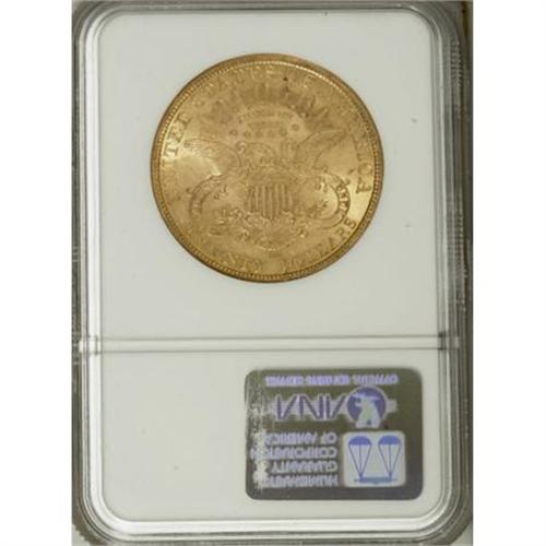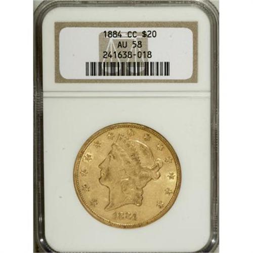 <B>1884-CC $20 AU58 NGC.</B></I> According to Douglas Winter (2001), 1884-CC double eagles are nearly always abraded, and copper spots and grease stains are not uncommon. The high-end AU specimen in the present lot possesses a uniform distribution of small marks on the obverse, while the reverse is relatively clean for a large, heavy gold coin. Peach-gold surfaces show a good amount of luster, and are completely devoid of spots or stains. This piece will fit quite nicely in a high-grade type set.<BR><I>From The Vanek Collection.</B></I><BR><BR><b>Shipping:</b> Coins & Currency (<a target="_blank" href="http://www.heritageauctions.com/common/shipping.php">view shipping information</a>)