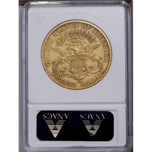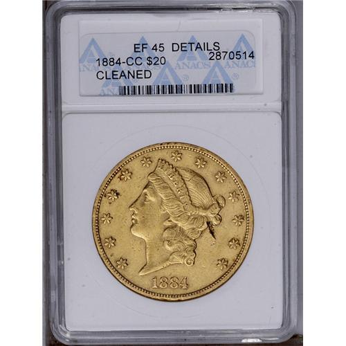 <B>1884-CC<$20>--Cleaned--ANACS. XF45 Details.</B></I> The surfaces are subdued by a mild cleaning, but the collector is more likely to be distracted by a scratch beneath the hair bun and concealed tooling on the hair beneath the ear. The obverse rim is intermittently abraded.