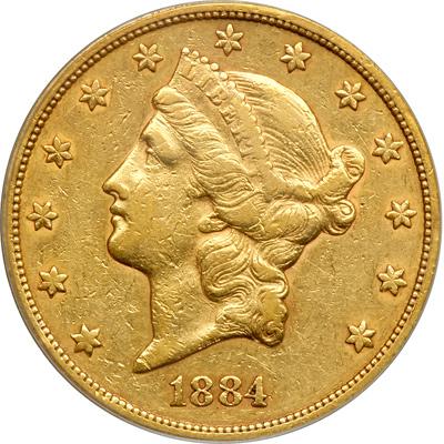 1884-CC $20 Liberty. PCGS graded VF-35. Lightly toned. An estimated survival rate of only 2,525 pieces (PCGS # 9001) .