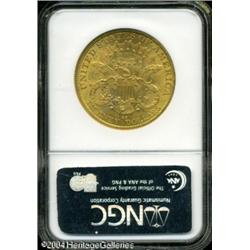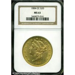 1884-CC $20 MS61 NGC. Peppered with small, but num <B>1884-CC $20 MS61 NGC.</B></I> Peppered with small, but numerous, abrasions on each side, the luster is complete throughout and there is a hint of green-gold color on each side. Very scarce in strict Uncirculated condition and in much demand as a CC type coin. <BR><BR><B>Important notice:</B> Heritage usually auctions material at the rate of 200-250 lots per hour. On some occasions eBay Live bid software or the Internet may not be able to keep up with the pace of the auction. We recommend placing a realistic absentee bid now as insurance to avoid disappointment. Occasionally the auctioneer may eliminate or reject an eBay Live bid, and the auctioneer may also reopen a lot after the close of the eBay live bidding (usually because we missed an audience bid), and may reject your bid even if it shows you as the winning bidder. By bidding via eBay Live, you agree that Heritage may award the lot to another bidder at its sole discretion under the circumstances described above or any other reasonable circumstances. Since eBay bids are not shown to us until we open the lot on the floor, we treat those bids just like floor bids. In most cases the floor responds before the eBay bid is presented to us, due to Internet lag time, so for consistency we have made it a policy that floor bids are always considered first over tie eBay live bids. Also please note that all Heritage lots purchased through eBay Live carry a 20% Buyer's Premium. Please make sure you read the Terms and Conditions before you bid. This lot is being auctioned in conjunction with a live floor auction by Heritage Galleries & Auctioneers. All final auction and invoice information will be supplied by Heritage Galleries & Auctioneers, and all other information should be considered preliminary. Lot:6924