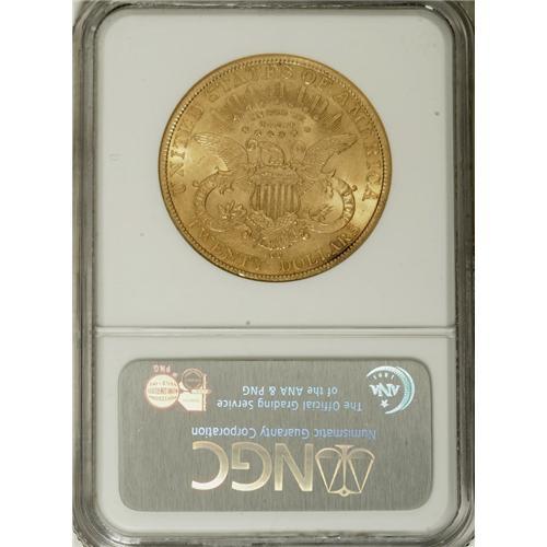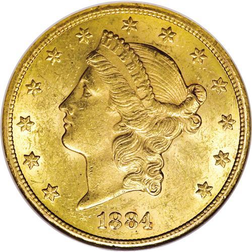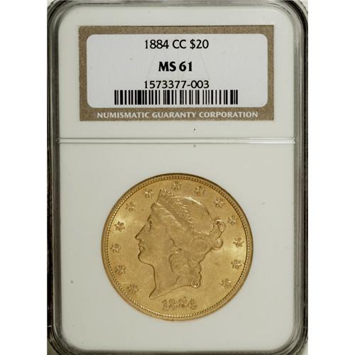 <B>1884-CC $20 MS61 NGC.</B></I> This issue is not a particularly rare Carson City double eagle, but rather it is one of the most plentiful examples of the Nevada coin factory. Both sides are fully lustrous with impressive yellow-gold surfaces that exhibit signs of greenish color. The surfaces are frosty and the entire presentation is most appealing.<BR><BR><b>Shipping:</b> Coins & Currency (<a target="_blank" href="http://www.heritageauctions.com/common/shipping.php">view shipping information</a>)