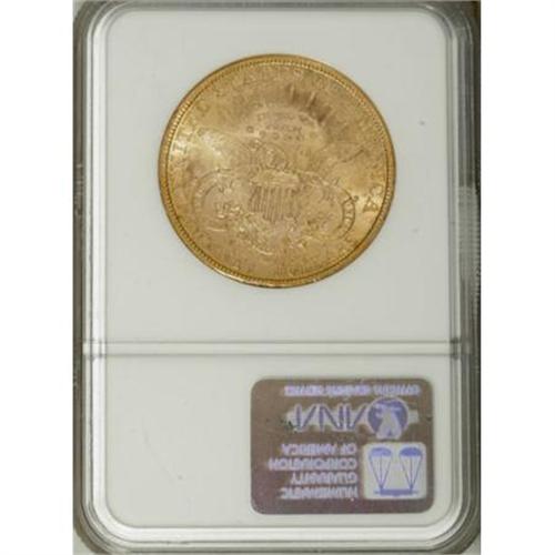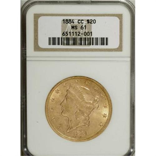 <B>1884-CC $20 MS61 NGC.</B></I> Booming luster sweeps this solidly struck CC-mint twenty. The reverse rim is abraded near 6:30, but the fields and devices show only faint grazes along with a few minor marks. Grover Cleveland, an opponent of the Carson City Mint, was elected to his first term in 1884.<BR><BR><b>Shipping:</b> Coins & Currency (<a target="_blank" href="http://www.heritageauctions.com/common/shipping.php">view shipping information</a>)