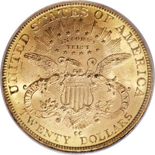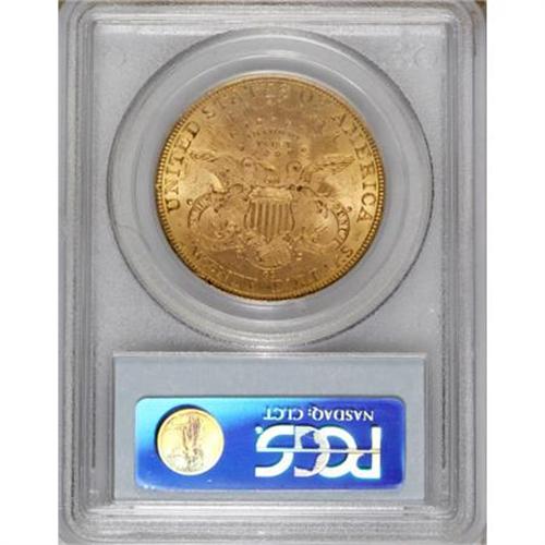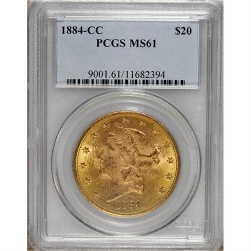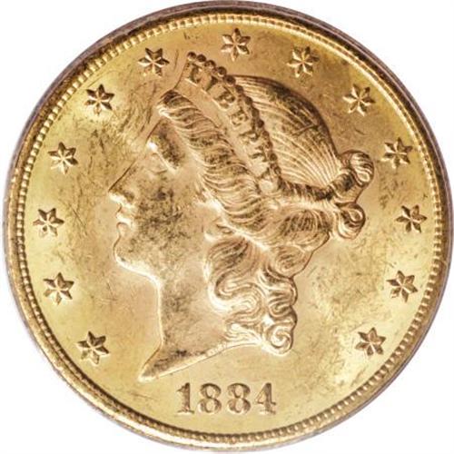 <B>1884-CC $20 MS61 PCGS.</B></I> Variety 1-A. One of the few Carson City gold issues for which a Mint State example is not automatically a condition rarity, the 1884-CC double eagle has long been popular with collectors. This frosty, attractive example displays bold central detail. The sun-gold fields have strong peach and orange overtones, though they also display a number of scattered, grade-defining abrasions. Population: 57 in 61, 35 finer (5/07).<BR><BR><b>Shipping:</b> Coins & Currency (<a target="_blank" href="http://www.heritageauctions.com/common/shipping.php">view shipping information</a>)