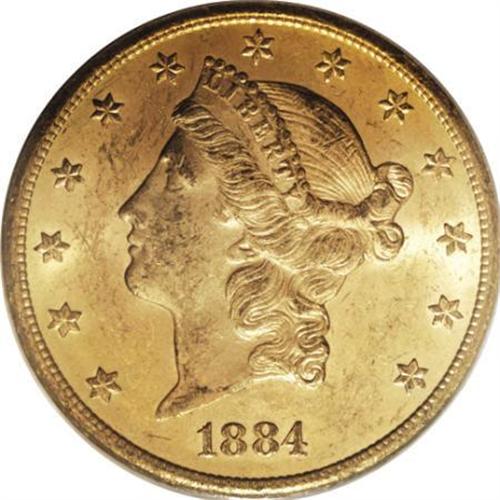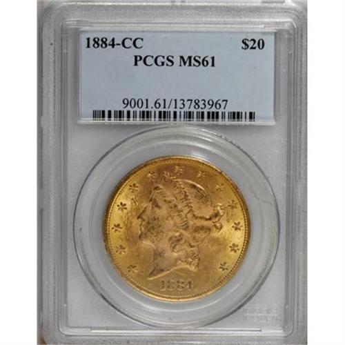 <B>1884-CC $20 MS61 PCGS.</B></I> A median rarity in the Carson City series with Uncirculated examples occasionally available. This is an attractive, fully frosted that shows numerous small abrasions, most of which are peppered across the obverse. Sharply defined throughout, which is an important consideration on this issue as many are weakly struck on the obverse. Rich orange-gold color. <BR><BR><B>Coin Engraver:</B> James B. Longacre<BR><BR><b>Shipping:</b> Coins & Currency (<a target="_blank" href="http://www.heritageauctions.com/common/shipping.php">view shipping information</a>)