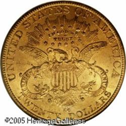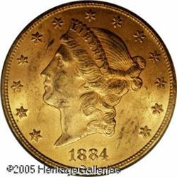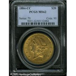<B>1884-CC $20 MS62 PCGS.</B></I> Outstanding quality for this conditionally scarce CC Twenty, with full, unbroken satiny luster and natural layers of reddish-orange and olive patina. A great looking '84-CC and an issue that is almost never seen finer. Population: 25 in 62, 4 finer (1/05). Lot:9181