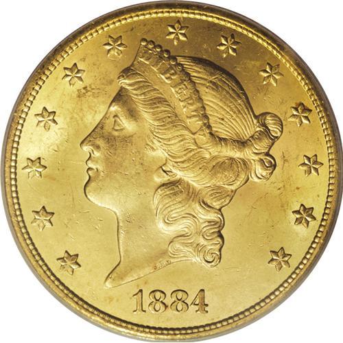 <B>1884-CC $20 MS62 PCGS.</B></I> The 1884-CC double eagle is a plentiful issue from a mintage of 81,139 coins, the fifth highest mintage of any Carson City Mint double eagle. Many of those coins were shipped overseas for trade purposes, where they remained in storage until more recent times, when they were returned to the U.S. for distribution in the numismatic trade. Nearly all known examples are in lower Mint State grades with MS62 representing the best that any collector can reasonably aspire to own. Only four finer coins have been certified by PCGS, and all four grade MS63. This example is a remarkable Mint State piece with sharp design elements and frosty yellow-gold surfaces. A few light abrasions are expected at the grade level, but the overall eye appeal suggests a higher grade. Population: 31 in 62, 4 finer (2/07).<BR><BR><b>Shipping:</b> Coins & Currency (<a target="_blank" href="http://www.heritageauctions.com/common/shipping.php">view shipping information</a>)