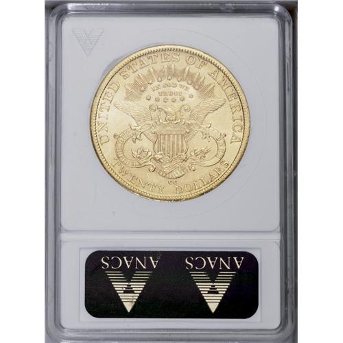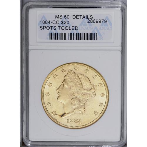<B>1884-CC<$20>--Spots Tooled--ANACS. MS60 Details.</B></I> Well struck with nice luster on the yellow-orange surfaces. Tooling marks are evident near the point of the bust, where someone has attempted to scrape away some dark spots just above the truncation.