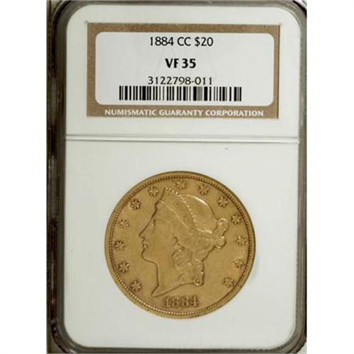 <B>1884-CC $20 VF35 NGC.</B></I> Subtle peripheral luster enlivens each side of this attractive Choice VF CC-mint double eagle. Pleasingly detailed with few marks on the generally smooth honey-gold surfaces.<BR><BR><B>Coin Engraver:</B> James B. Longacre<BR><BR><b>Shipping:</b> Coins & Currency (<a target="_blank" href="http://www.heritageauctions.com/common/shipping.php">view shipping information</a>)