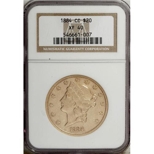 <B>1884-CC $20 XF40 NGC.</B></I> Boldly struck and still somewhat lustrous, with light tan-gold color and even highpoint wear. Numerous small marks inhabit the obverse and reverse surfaces.<BR><BR><b>Shipping:</b> Coins & Currency (<a target="_blank" href="http://www.heritageauctions.com/common/shipping.php">view shipping information</a>)
