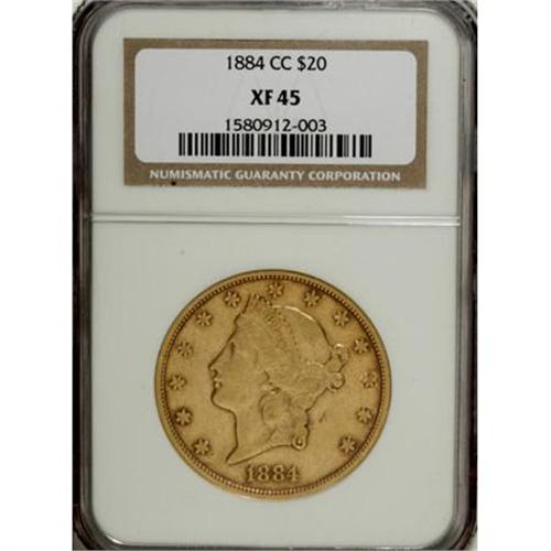 <B>1884-CC $20 XF45 NGC.</B></I> This lightly worn yellow-orange example displays strong luster for the grade, particularly on the reverse. Well-defined as always with few distracting marks. A pleasing and affordable example of this higher-mintage Carson City double eagle issue.<BR><BR><B>Coin Engraver:</B> James B. Longacre<BR><BR><b>Shipping:</b> Coins & Currency (<a target="_blank" href="http://www.heritageauctions.com/common/shipping.php">view shipping information</a>\)