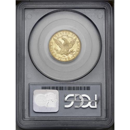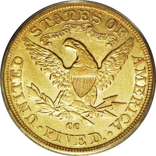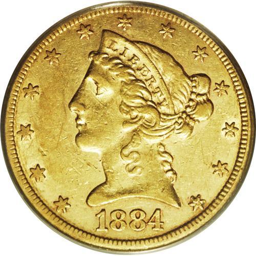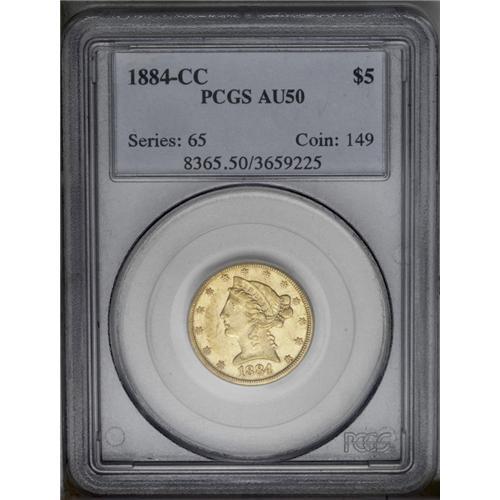 <B>1884-CC $5 AU50 PCGS.</B></I> Variety 1-A. <I>Gold Coins of the Carson City Mint</B></I> by Douglas Winter ranks the 1884-CC and 1883-CC half eagles in a tie as the ninth rarest of the series, and among the 1880s date they are second in rarity only to the 1881-CC. The present specimen has attractive, light honey-gold surfaces that emit considerable radiance, despite their brief stint in circulation. The expected trivial, grade-consistent abrasions are seen under a loupe, and the strike is a bit deficient on the eagle's neck. Otherwise, this example retains a high degree of charm and collectibility. Population: 17 in 50, 26 finer (1/06).