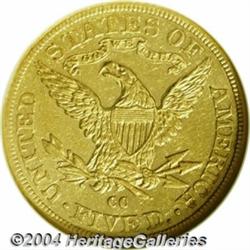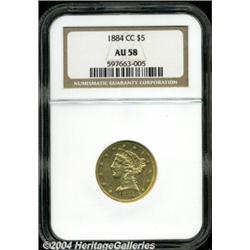 <B>1884-CC<$5> AU58 NGC.</B></I> Winter 1-A. A near-Mint example of this scarce and worthwhile Carson City Five. Sharply defined, the surfaces sparkle with a surprising amount of luster remaining on each side as the coin is turned under a light source. A few light field marks are scattered over each side.<BR><I>From The Barry Donnell Collection, Part Two.</B></I> <BR><BR><B>Important notice:</B> Heritage usually auctions material at the rate of 200-250 lots per hour. On some occasions eBay Live bid software or the Internet may not be able to keep up with the pace of the auction. We recommend placing a realistic absentee bid now as insurance to avoid disappointment. Occasionally the auctioneer may eliminate or reject an eBay Live bid, and the auctioneer may also reopen a lot after the close of the eBay live bidding (usually because we missed an audience bid), and may reject your bid even if it shows you as the winning bidder. By bidding via eBay Live, you agree that Heritage may award the lot to another bidder at its sole discretion under the circumstances described above or any other reasonable circumstances. Since eBay bids are not shown to us until we open the lot on the floor, we treat those bids just like floor bids. In most cases the floor responds before the eBay bid is presented to us, due to Internet lag time, so for consistency we have made it a policy that floor bids are always considered first over tie eBay live bids. Also please note that all Heritage lots purchased through eBay Live carry a 20% Buyer's Premium. Please make sure you read the Terms and Conditions before you bid. </span></font></tr></table></td></tr></table>
