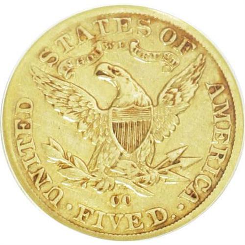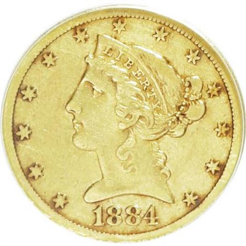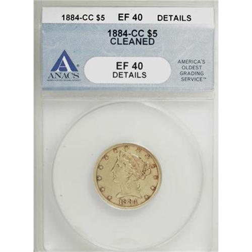 <B>1884-CC $5 --Cleaned--ANACS .XF40 Details.</B></I> NGC Census: (8/127). PCGS Population (10/71). Mintage: 16,402. Numismedia Wsl. Price for NGC/PCGS coin in XF40: $1,025. (#8365)<BR><BR><B>Coin Engraver:</B> Christian Gobrecht<BR><BR><b>Shipping:</b> Coins & Currency (<a target="_blank" href="http://www.heritageauctions.com/common/shipping.php">view shipping information</a>)