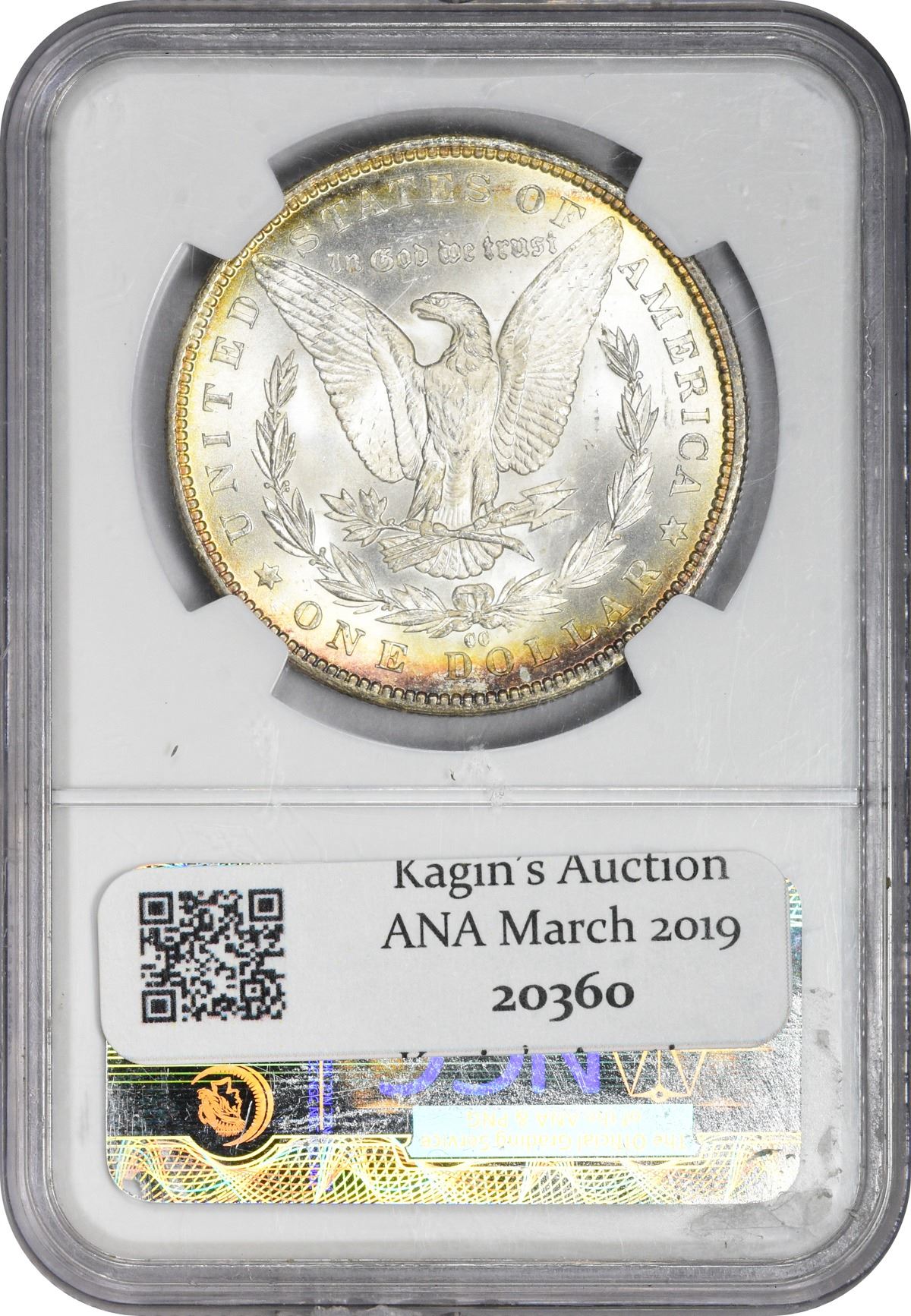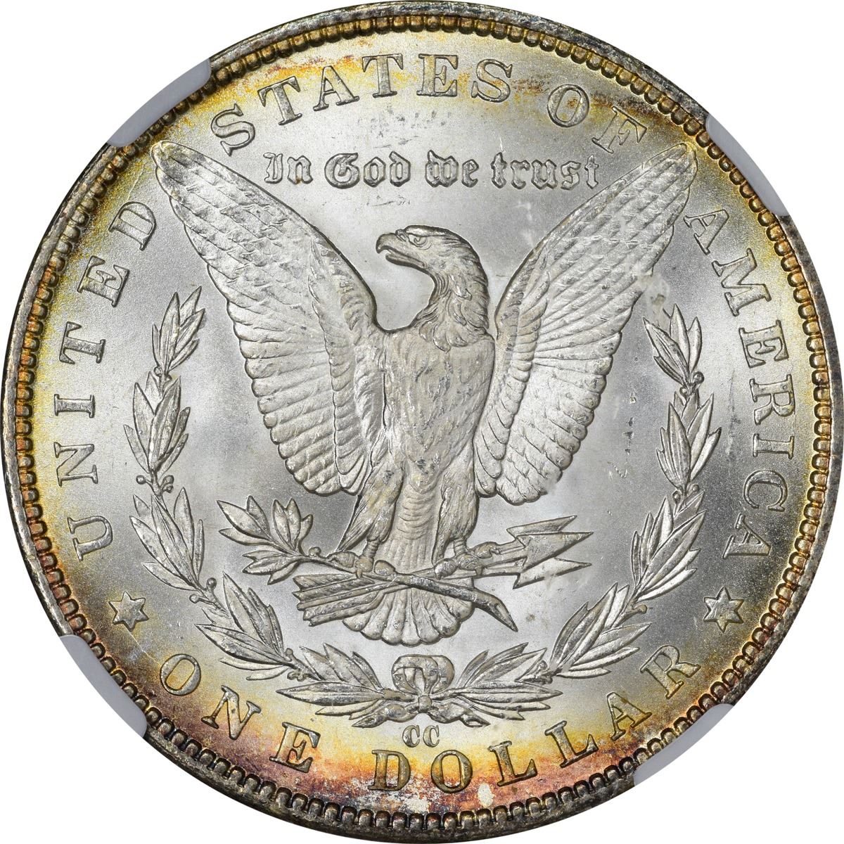 The obverse of this sharply struck Carson City gem is completely engulfed in vibrant violet, fiery peach, and neon blue iridescence. The reverse presents the other side of the equation with full-blown mint brilliance at the center that gives way to a modest rimfire halo of varied sunset-orange tones. An exceptional coin for the grade.