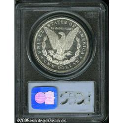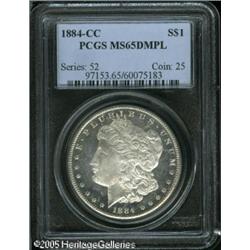 <B>1884-CC<img border='0' src='http://www.heritagecoins.com/images/star.gif' width=10 height=10>$1 MS65 Deep Mirror Prooflike PCGS.</B></I> Mottled steel-blue, apricot, and golden toning over full underlying luster. The strike is nice and the surfaces minimally abraded for the grade. Lot:10160