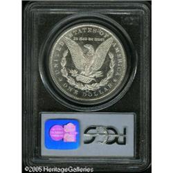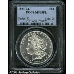<B>1884-CC<img border='0' src='http://www.heritagecoins.com/images/star.gif' width=10 height=10>$1 MS65 Prooflike PCGS.</B></I> Sharply struck with scintillating mint frost and dazzling reflectivity in the fields on each side of this beautiful black and white Gem. There are a few tiny contact marks on Liberty's cheek, and a handful of field marks on the reverse, that keep the grade assessment from being even higher. Lot:10155