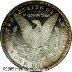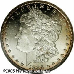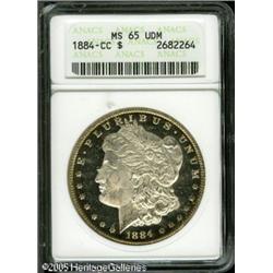 <B>1884-CC<img border='0' src='http://www.heritagecoins.com/images/star.gif' width=10 height=10>$1 MS65 Ultra Deep Mirror Prooflike ANACS.</B></I> This beautiful CC example projects a cameo-like appearance. Exquisitely struck design features and deep amber toning about the borders enhance the eye appeal of this flashy Morgan dollar. Just a few minor luster grazes are seen on Liberty's cheek and in the fields on each side. Lot:10161