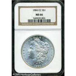 <B>1884-CC<img border='0' src='http://www.heritagecoins.com/images/star.gif' width=10 height=10>$1 MS66 NGC.</B></I> Sharply struck and highly lustrous with fully brilliant obverse and reverse surfaces. Lot:10146