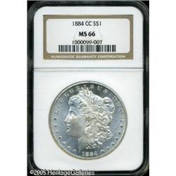 <B>1884-CC<img border='0' src='http://www.heritagecoins.com/images/star.gif' width=10 height=10>$1 MS66 NGC.</B></I> Sharply struck and untoned, with a thick layer of mint frost over both sides of this stunningly attractive premium Gem. Minimally marked, as expected for the assigned grade. Luster like this is not often seen on a Morgan dollar, of any year. Lot:10147