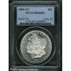 <B>1884-CC<img border='0' src='http://www.heritagecoins.com/images/star.gif' width=10 height=10>$1 MS66 Prooflike PCGS.</B></I> Attractive prooflike surfaces show just a touch of tan color on the motifs. There are no mentionable marks to report. Well struck throughout. Lot:10156