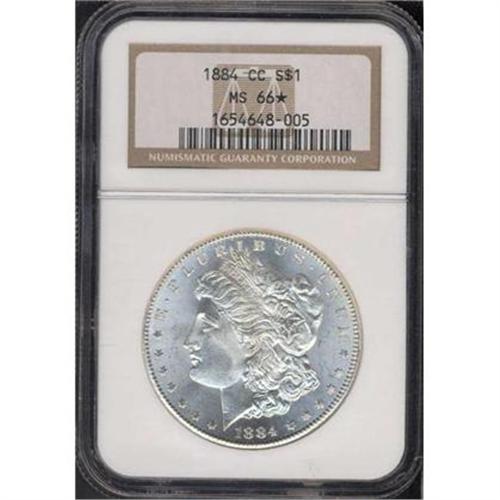 <b>1884-CC Morgan Dollar. NGC graded MS66 Star.</b> Milky white surfaces swirl with cartwheel luster. It is interesting to see, as well, that it was struck from well-prepared dies that imported a sound and in point of fact, a bold design in the following areas: central hair relief above Liberty's ear, and the eagle's breast feathers. The presence of such beauty explains why NGC also gave this its star determination of better than average "eye appeal." <b>(PCGS # 7152)</b>