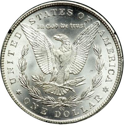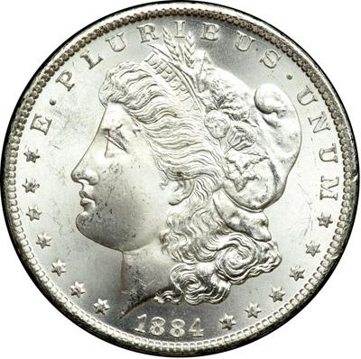 1884-CC Morgan Dollar. NGC graded MS-66. A gorgeous frosty "CC" mint Morgan. Blast white. An appealing gem. Pop 304; 23 finer, 10 in 66 Star, 12 in 67, 1 in 67 Star. Housed in the large black GSA holder (PCGS # 7152) .