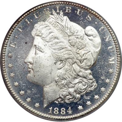 1884-CC Morgan Dollar. PCGS graded MS-64 Deep Mirror Prooflike. A fully brilliant example. How can any collector keep up with the flow of exceptional prooflike specimens in this sale. Their beauty almost bankrupts the vocabulary! The present CC mint example is right up there with the best in its grade. Only positive things to say about it! (PCGS # 97153).
