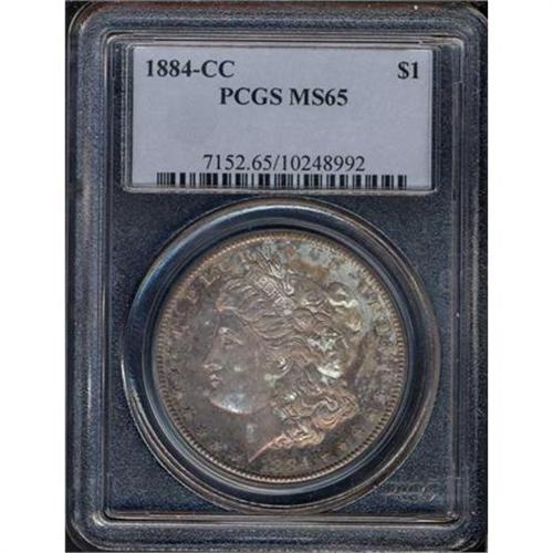 <b>1884-CC Morgan Dollar. PCGS graded MS65.</b> An unusually high quality coin for the date, this specimen displays riveting toning over satin surfaces, is uncleaned, with sharp detail including the centers <b>(PCGS # 7152)</b>