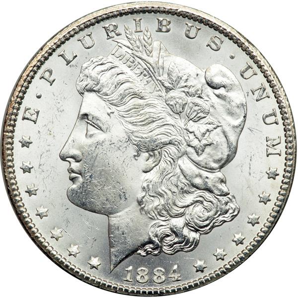 1884-CC Morgan Dollar. PCGS graded MS-65. Well struck and lustrous, a gleaming white Gem. Were it not for the fortuitous GSA Treasury release in the 1970s, the 1884-CC would be much more expensive and less available to collectors than it is today (PCGS # 7152) .