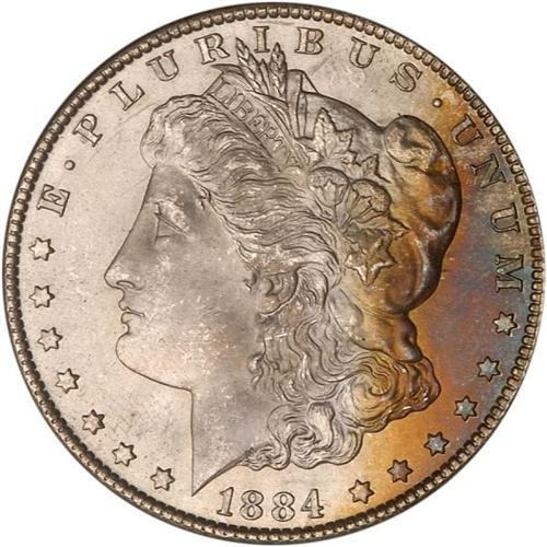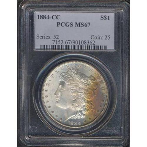 <b>1884-CC Morgan Dollar. PCGS graded MS67.</b> The silvery hue reciprocates between levels of frost and satin-texture and includes a component of deep rich golden brown to amber toning. Everywhere you look there is lustrous surface and well struck devices with rocking-fresh surfaces. The clear-cut devices point to it having been giving a full strike by the dies. What a marvel of surface preservation! <b>(PCGS # 7152)</b>