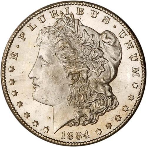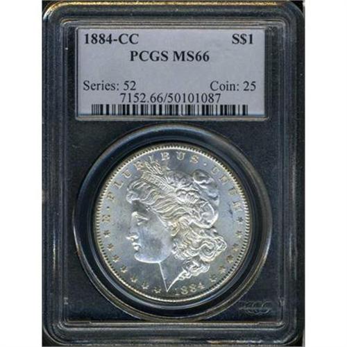 <b>1884-CC Morgan Dollar. PCGS graded MS66.</b> Very few survivors could possibly equal the nearly superb technical merits and originality of this frosty piece. In addition to its strong strike and nearly flawless surface quality, both sides are gleaming with mint brilliance. Precision strike on every device. Don't worry if you come up against those fussy, bullying competitors when this coin's turn comes to sell, just hang in there and bid aggressively <b>(PCGS # 7152)</b>