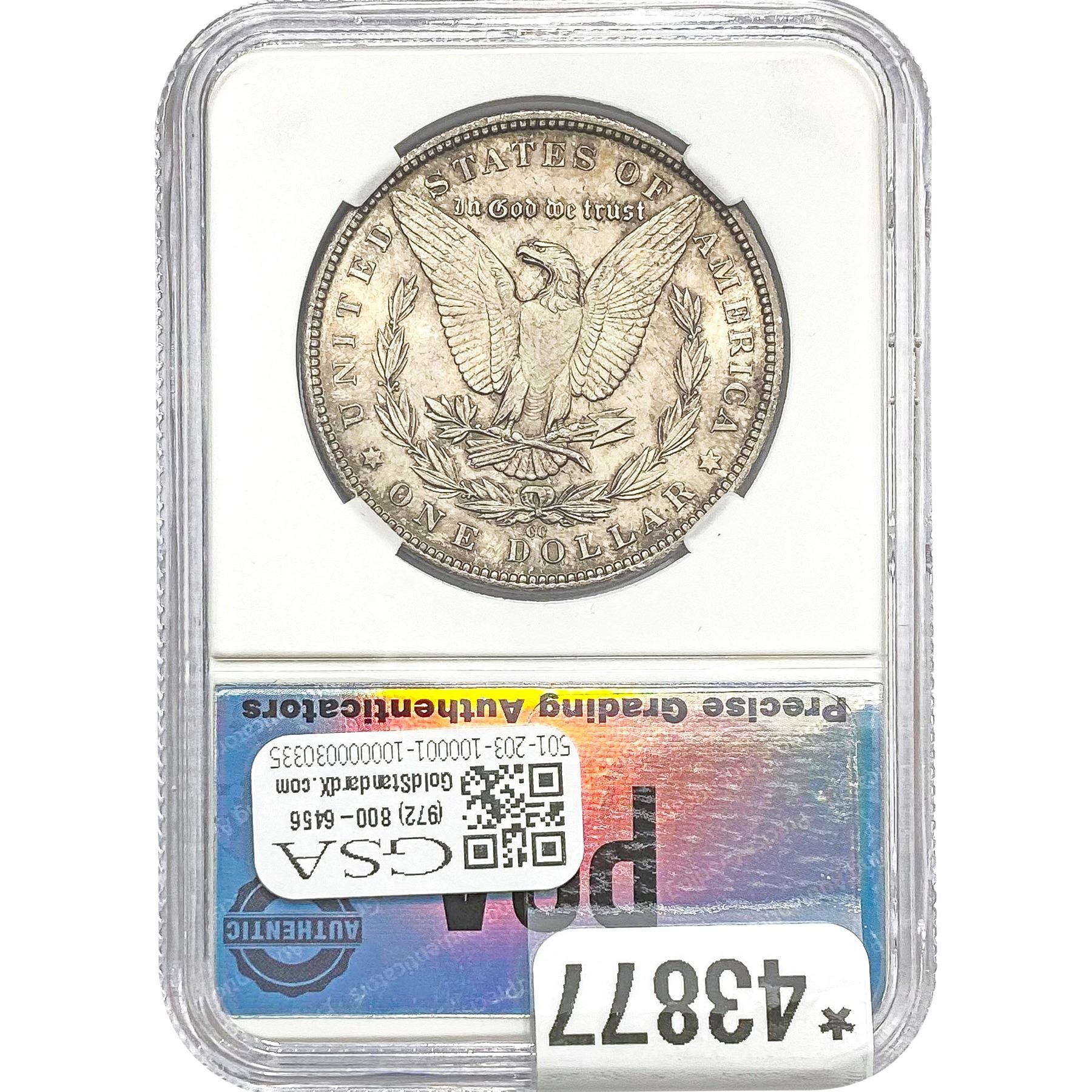 COINS AND CURRENCY LISTED IN GSA’S CATALOG AS GRADED AND ENCAPSULATED BY PCGS, NGC, ANACS, ICG, PCGS CURRENCY, PMG, PCGS BANKNOTE GRADING, CMC OR ANY OTHER THIRD-PARTY GRADING SERVICE ARE LIKEWISE SOLD “AS-IS” EXCEPT AS EXPRESSLY SET FORTH HEREIN. ALL THIRD-PARTY GRADING SERVICE GUARANTEES, INCLUDING AUTHENTICITY, ARE THE SOLE RESPONSIBILITY OF THE THIRD-PARTY GRADING SERVICE AND NOT WARRANTIES OR GUARANTEES OF GSA. BIDDERS SHOULD CONTACT THESE THIRD-PARTY GRADING SERVICES DIRECTLY WITH RESPECT TO ANY CLAIMS OR QUESTIONS THEY MAY HAVE CONCERNING THEIR GUARANTEES AND WARRANTIES. BIDDERS ACKNOWLEDGE AND AGREE THAT AUCTIONEER IS NOT BOUND BY OR LIABLE FOR ANY OPINION OR CERTIFICATION BY ANY THIRD-PARTY GRADING SERVICE. REMOVAL OF A PRODUCT FROM ITS PROTECTIVE CASING OR HOLDER OR ALTERATION OF ANY COIN HOLDER WAIVES ALL RIGHTS CONCERNING THE PRODUCT CONTAINED THEREIN.