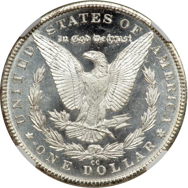 1884-CC Morgan. NGC graded MS-66 Deep Prooflike. A fully white gem, blazing with two-tone contrast between the reflective field and snow-white frost on the devices. Pop 45; 3 finer in 67DPL.